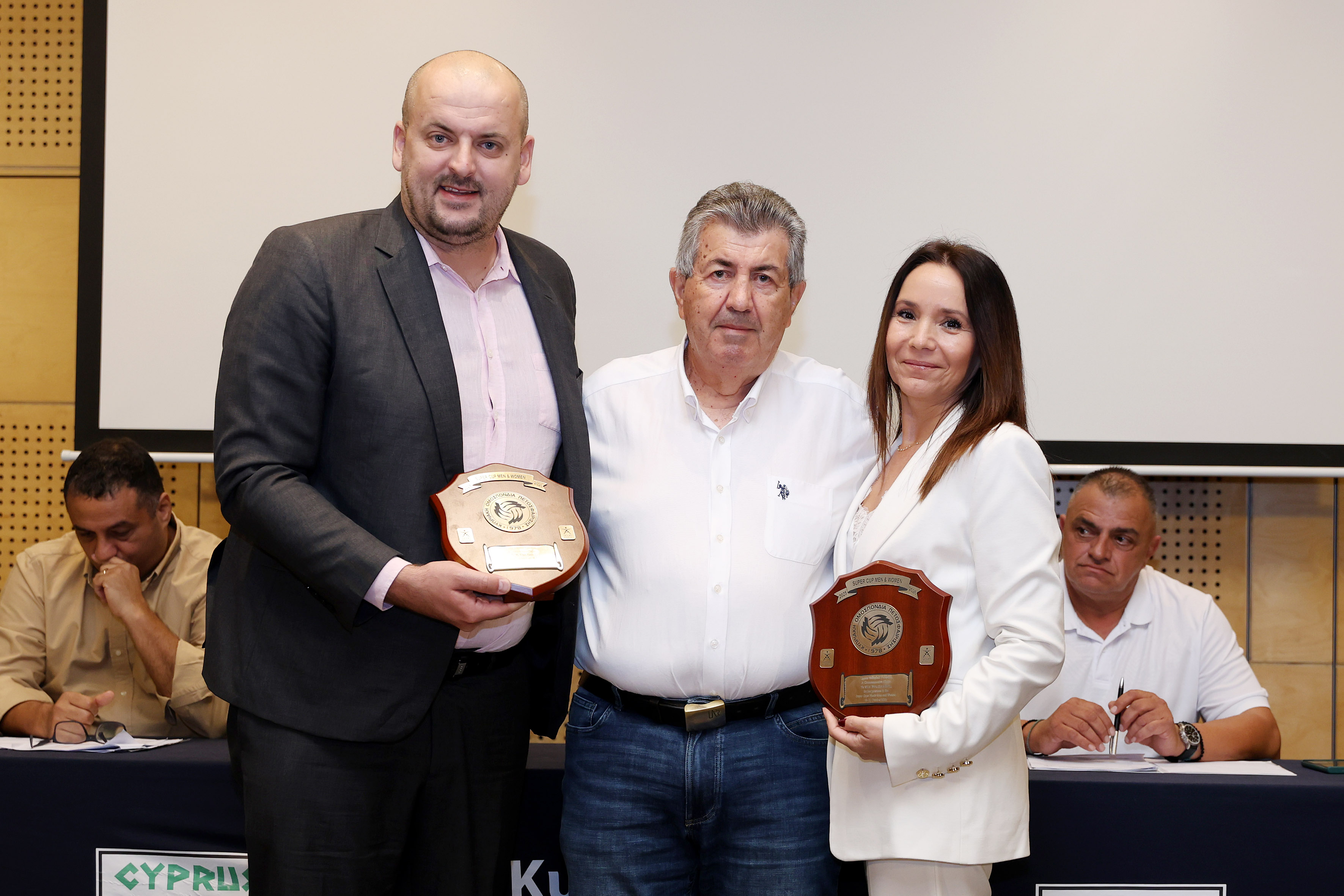 To recognise their contribution and continued support, the Cyprus Volleyball Federation President presented the MEVZA representatives with commemorative plaques - small replicas of the Super Cup shields designed for the 2025 edition of the competition.